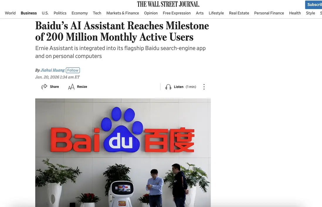 AI大模型工場 1月20日消息,據《華爾街日報》報道,百度旗下文心助手月活用戶數已突破2億,與豆包、千問形成國內三大億級AI入口。